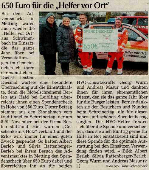 Unser Erlös aus dem Verkauf "Geschenke in Holz" ging dieses Jahr an unsere Ortsfeuerwehr die FFW Metting. Wir wollen mit unserer Spende die unschätzbare Arbeit der Feuerwehr für uns alle unterstützen.
